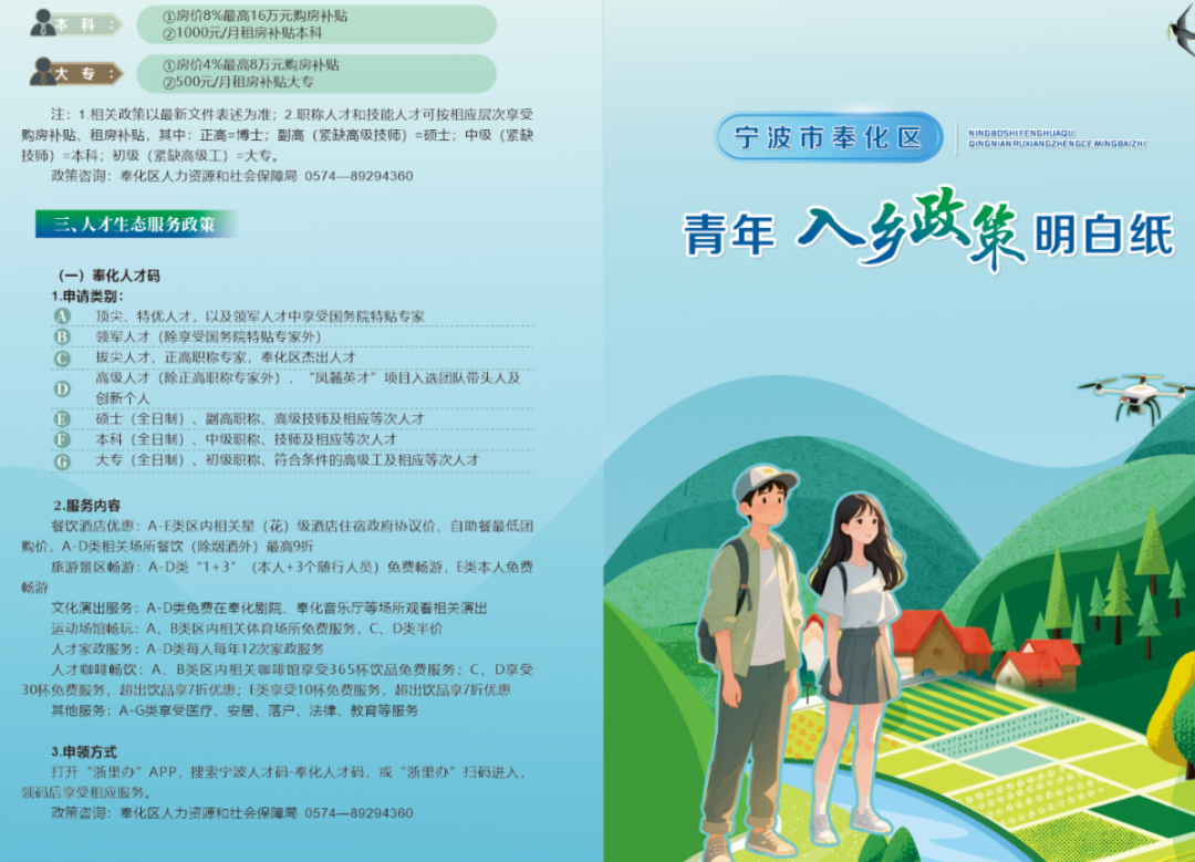 类似的优惠政策,还不止这些,奉化区出台《宁波市奉化区支持青年入乡发展的六项举措》(以下简称“新政”),从支持创业、助力就业、成长培育、安居保障、生活优待、平台赋能等六方面,为青年入乡发展保驾护航。